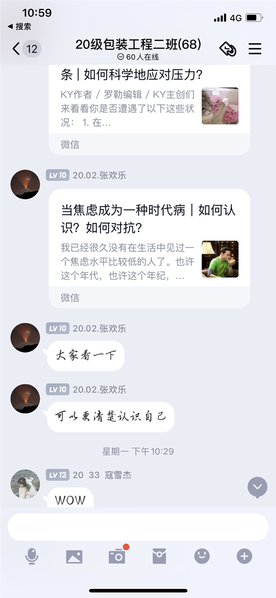 10月21日-28日,分专题向班群内推送心理健康知识相关文章,文章内容主要以调节情绪为主。作为此次心理健康活动周重要的宣传方式,不仅丰富员工校园生活,营造活动氛围,宣传健康理念,展现同学们的才能与创新意识;亦使得更多老员工了解心理健康的的实质,培养老员工正确的心理健康观念,使得更多的员工重视心理健康问题。