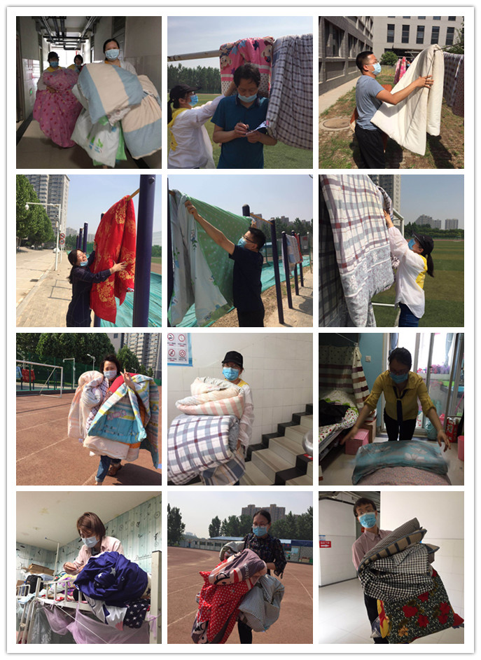 为了让员工有平安宁静的学习环境,院领导亲自带领全体教师为员工打扫教室和实验室,安排好个性化的心理舒缓室、专门考研复试室、应聘面试室;为了让员工有舒适安心的生活环境,全体教师为即将返校的74名员工晾晒被褥,从编号,搬运,翻面,再到收回,老师们细致入微,确保每条被褥都接收到充足阳光,并为每个宿舍摆放提前准备的绿植和消毒洗手液;为了以最简便而又不失温馨的方式提醒员工做好返校后的健康管理,为每位员工做温馨提示卡……