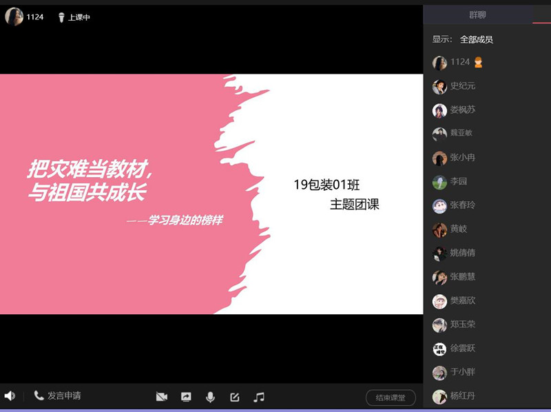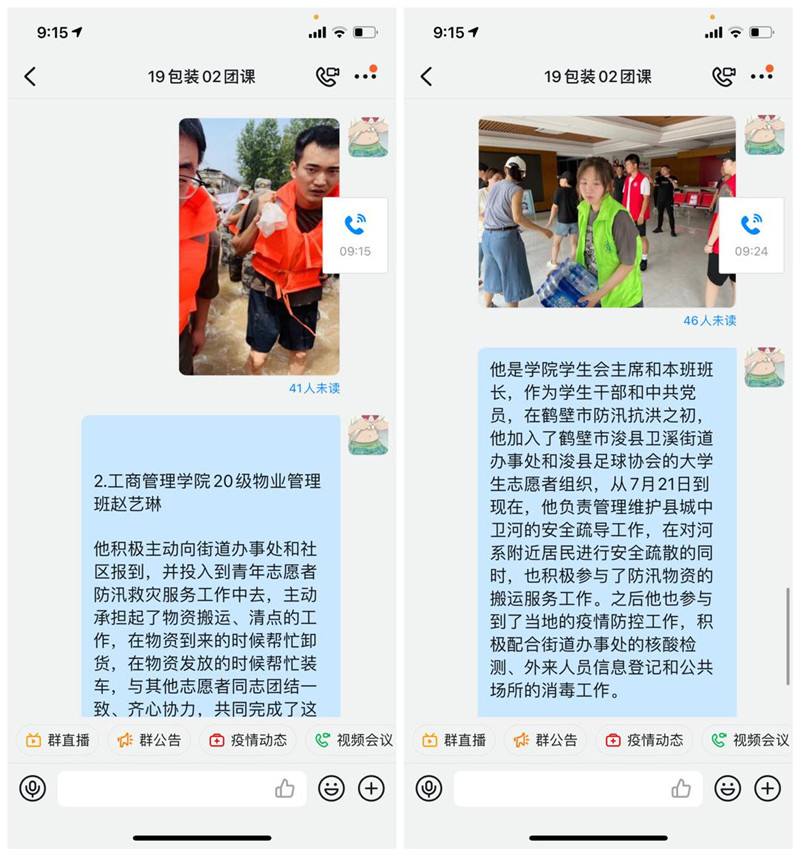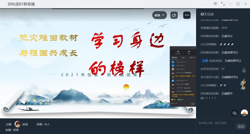 在此次团课活动中,各班主讲人通过钉钉直播、图文分享、播放视频等多种形式讲述了在我省防汛救灾和疫情防控工作中,公司广大师生众志成城、共克时艰的感人故事,尤其是身边优秀的青年员工榜样,无论是动物医院公司20级动医2班孙逸冰同学还是经济与贸易公司20级农业经济管理1班孙永康同学以及公司许多优秀学子,他们都投身到防汛救灾志愿服务中去,踊跃参与、冲锋在前、勇担重任,用实际行动展现了当代青年深厚的家国情怀和新时代青年的责任担当。最后,各班主讲人号召班内同学要向身边的优秀榜样学习,把困难当磨砺,在具体实践中涵养厚植爱国主义情怀。