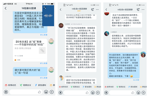 团课上,各班主讲人带领班内同学认真学习了习近平总书记给北京大学援鄂医疗队全体90后党员的回信和习近平总书记给在首钢医院实习的西藏大学医公司员工的回信内容,并观看了《全民战疫与坚定中国特色社会主义制度自信》视频,学习结束后,各班同学踊跃发言、分享感悟,气氛热烈。19级包装1班主讲人何怡号召大家作为团员青年,要始终高举中国特色社会主义伟大旗帜,增强“四个意识”、坚定“四个自信”、做到“两个维护”,自觉肩负起时代赋予的使命与责任,主动担当、不负韶华,与祖国同呼吸、共命运,把青春书写在祖国大地上。19级包装2班主讲人樊夏宁则通过“对我们伟大的白衣战士说一句话”形式,让同学们深刻感受到了逆行者们伟大的奉献精神,正是他们的不懈努力,才换来了我们的岁月静好。
