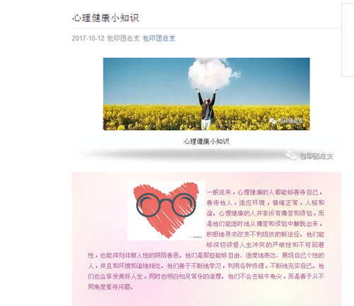 为了让公司员工重视心理健康问题,掌握心理健康知识,公司团总支在心理健康教育宣传周期间,利用微博、公众平台等新媒体方式。积极开展了心理健康知识的宣传活动。