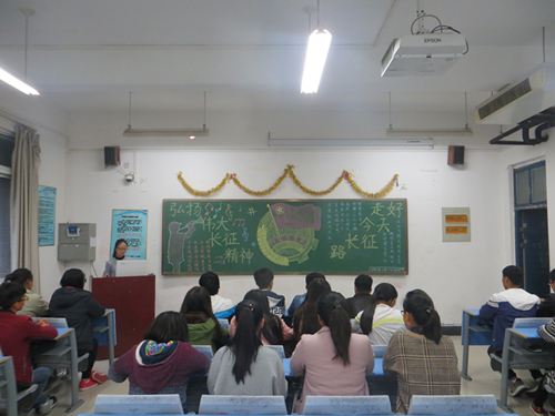 在此次团课活动中,各班团支书和宣传委员精心准备板报和有关长征的素材,各班充分利用各种形式,学习习近平总书记的讲话精神,充分体会长征精神的价值和意义。其中印刷班为同学们播放了习近平总书记在纪念红军长征胜利80周年大会上的讲话视频,包装工程三班先由雷世昌同学为大家讲解了长征精神,后由团支书带领大家在庄严肃穆的氛围下合唱了国歌,重温了革命先烈们壮志豪情。包装工程二班的李哲同学则独自为大家演唱了国歌,在慷慨激昂的旋律中,此次团课圆满结束。
