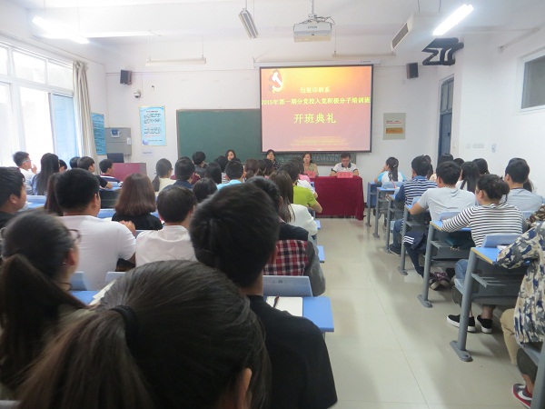 为贯彻落实党的十八大、十八届四中全会精神,加强入党积极分子的教育培训,提高党员发展质量,2015年4月29日中午13:00,我系于龙子湖校区A222教室隆重举行2015年年第一期分党校入党积极分子培训班开班典礼。系党总支书记吴静、党总支副书记聂莉、团总支书记曲媛媛、辅导员肖根生、屈贞财出席开班典礼,74名入党积极分子到会参加。会议由系团总支书记曲媛媛主持。