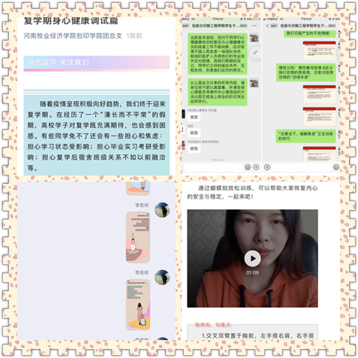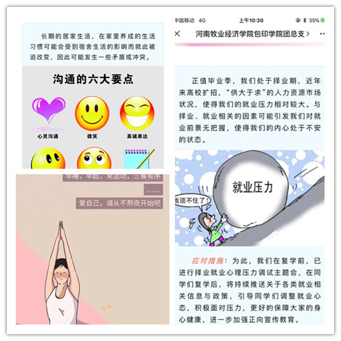 在员工居家学习阶段至复学归来,充分利用公司官网、微信公众号等新媒体平台,通过图文、视频、线上主题会等形式,围绕疫情居家心理调试、毕业季就业压力缓解、复学归来阶段的心理适应策略等帮助缓解员工的焦虑心理。