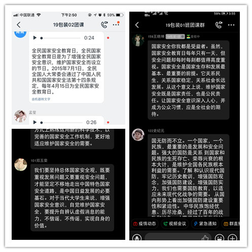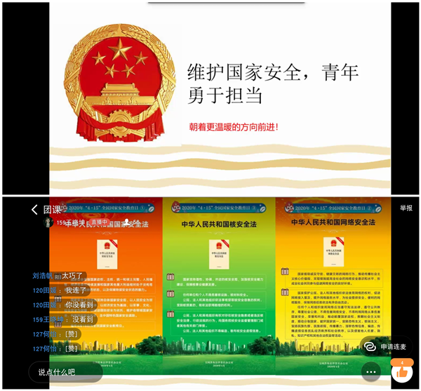 为进一步深化和推动国家安全教育,提高广老员工国家安全意识,切实增强维护国家安全自觉性, 4月16日下午,公司组织19级各班分别在以钉钉群直播的形式开展了以“维护国家安全,青年勇于担当”为主题的团课活动。