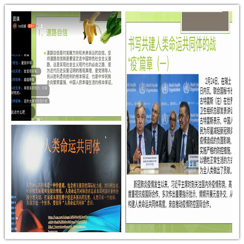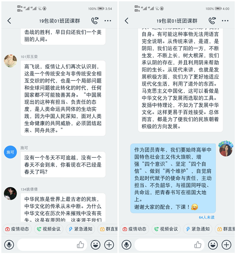 此次团课上,各班主持人组织本班同学认真学习了新华网发布的《书写共建人类命运共同体的战‘疫’篇章》,大家通过观看图片、视频、宣讲PPT以及语音通话讨论的形式,了解到此次疫情中中国对全球疫情防控做出的巨大贡献和习近平主席为推动新冠肺炎疫情防控国际合作所作出的努力。这场全球公共卫生危机,既是对国际合作的考验,也是对大国担当的检验。疫情发生以来,习近平主席时刻关注国内外疫情形势,高度重视抗疫国际合作,多次作出重要指示批示,从构建人类命运共同体高度,亲自推动疫情防控国际合作。同学们积极讨论,畅聊学习感悟,支持并坚定中国参与全球战“疫”的立场:以身作则,以行践言;恪守国际道义,践行大国担当。