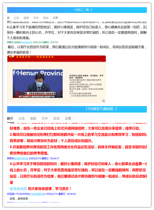 在全国人民万众一心、众志成城抗击疫情的关键时期,为认真贯彻落邦山厅长讲话精神,把疫情当作教材,做好员工的思想政治教育和学习管理工作,在前期持续开展线上教学和员工管理工作的基础上,2月19日,公司段婧、张晨景两位辅导员分别组织各班开展了以《以“疫”为鉴、励志勤学》为主题的线上班会。