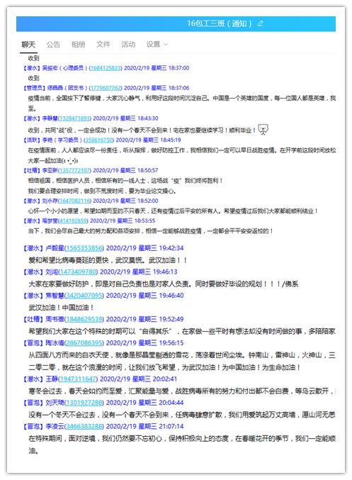 班会的最后,各辅导员老师再次强调了河南省新冠肺炎疫情防控第九场新闻发布会上郑厅长的讲话,鼓励各位同学保持积极良好的心态,用成长的足迹踩踏灾难,在疫情中与祖国共同成长,让不幸成为通往幸福的桥梁!