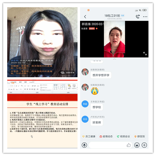 此次班会结合以直播、视频会议、语言、在线图文交流等多种各具特色的形式开展。班会上,辅导员老师对近期持续进行的每日健康打卡和网络教学开展情况进行了说明,同时对接下来这段时期的线上学习内容进行了具体安排:一是要做好日常的健康打卡、学习打卡和锻炼打卡,按照网络教学期间任课老师的要求完成各项学习任务;二是要将此次疫情作为素材,积极参与到“众志成城·防疫有我”线上主题团日、“疫路有你”优秀网络文化作品征集、“生命的名义”主题征文等活动中去;三是各员工干部要发挥作用,主动参与到教师的教学组织与管理中去。针对毕业班员工,段老师针对毕业论文写作、就业准备和考研复试三方面的提出了一些建议和要求,提醒各毕业班员工要针对今天疫情形势做好预判,调整状态,做好个人规划和准备。