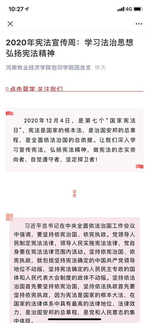 为增强员工的宪法意识,营造良好的宣传学习氛围,公司充分利用新媒体方式,通过宣传展板、团总支微信公众号、微博、QQ群等多种宣传手段,动员广老员工了解宪法日相关知识,引导老员工自觉成为宪法的忠实崇尚者、自觉遵守者、坚定捍卫者。