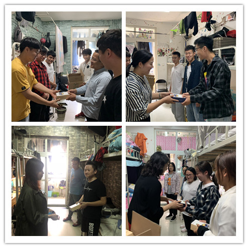 当天中午,副书记祝聪楠各班双导师分别深入17、18、19级员工宿舍,为每一位员工发放了月饼。发放过程中,老师们详细询问了同学们平时的学习、生活情况,大家纷纷对老师们的亲切关怀表示了感谢,一边品尝月饼一边畅聊日常,并与老师们亲切合影。