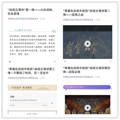 为贯彻党和国家中央关于疫情期间的重大决策部署,号召公司全体同学“同心抗疫”,弘扬新时代青年的正能量,公司近期利用微信公众号持续推出了“青春在战役中绽放”战疫云演讲系列活动。