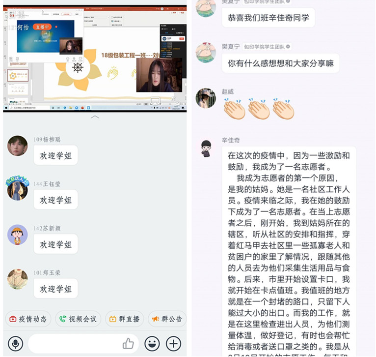 刘睿雯、辛佳琪、鲍林昌三位同学分别结合自身情况从榜样学习、志愿者服务等方面进行了精彩的分享。18级包装工程一班刘睿雯在团课过程中以连麦的形式进行了宣讲,她分享了自身主动捐赠的事迹,并表示在这次疫情之中,一方有难八方支援,我这次的捐赠也是希望可以尽自己的微薄之力,帮助大家共同抗疫,早日战胜病毒。”19包装工程二班辛佳奇则分享了自己在做疫情防控志愿者时的感受:“每一个在岗位上坚守的平凡人都真的付出了努力,做好了自己的工作,尽自己所能地去帮助国家和人民共渡难关,此时此刻,他们不再是平凡人,而是中国的英雄。也是在一线工作人员的坚守下,才有了现在的控制局面。19级印刷媒体技术鲍林昌说:“本次疫情期间,很荣幸能够作为志愿者为本次疫情贡献自己的一份力量,让我了解到志愿者服务活动培养我的不仅仅是一种精神,更是培养了自己的极限和耐力,同时也看到了自己的潜力。当我们奉献自己一份力量的时候,心里会觉得很幸福,觉得终于为社会做了一点力所能及的事情,在志愿活动中找到了自己的价值,教会了我思考人生的态度和看待人生的机会,更历炼了自己。”