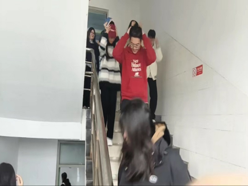 演练开始前,张排杰老师结合地震教育宣传片,为大家科普了地震发生的预兆、地震发生时的室内外应急处理方法和自救互救等知识,并针对防震应急疏散的程序、内容、路线向员工作了详细的讲解,强调了演练纪律和演练过程中的安全问题。演练开始,随着信号员发出第一声警报信号,同学们迅速躲进书桌底部进行紧急避险。当第二声长哨吹响,警报信号解除后,同学们纷纷用双手护住头部,弯腰低身,沿着指定疏散路线快速有序地撤离到操场的安全区域,到达安全区域后,各宿舍迅速清点人数,保证全员安全脱险。