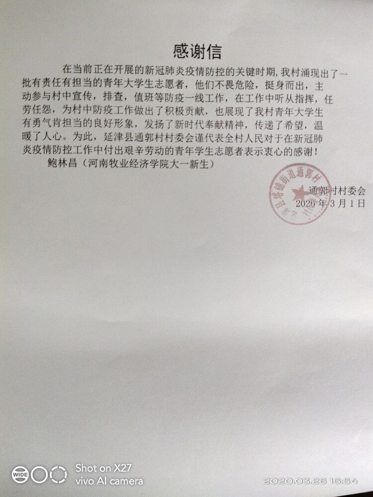 3月1日,延津县通郭村村委会发来感谢信,对公司英国365集团19级印刷01班鲍林昌同学在家乡疫情防控中的突出表现予以感谢。