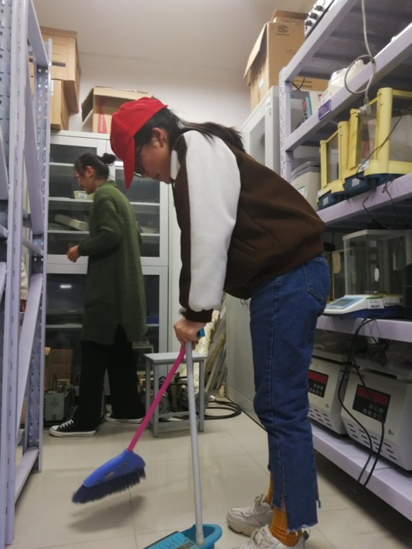 在实验室老师的安排和带领下,公司的志愿者们分成小组,有序投入到劳动之中。志愿者们对实验室进行彻底的清洁,将桌面、地面擦拭的干干净净,对地板与实验台的卫生死角进行了细致的清理。同时对各个实验室的实验器具进行分类整理,对于摆放不规范的实验用品进行了重新整理。在志愿者们将近两个小时的努力下,各个实验室的环境变得焕然一新。