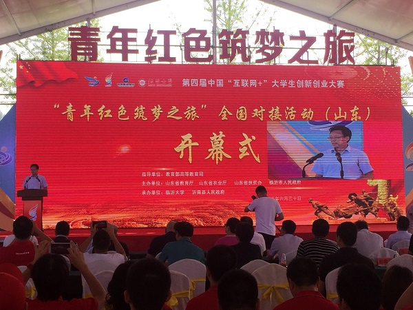 开幕式上,教育部高等教育司二级巡视员吴爱华等领导莅临现场并讲话致辞。吴爱华全面阐述了双创教育、双创大赛、红旅活动的重要意义和重要价值,对参加活动的同学们提出了新的希望与新的要求,并祝愿活动取得圆满成功。山东省委教务工委、省教育厅二级巡视员刘欣堂通报了此次活动的内容和安排,祝愿同学们在助力乡村振兴,精准扶贫的事业中成就自己辉煌的人生。临沂市张玉兰市长简述了沂蒙人民的革命事迹,介绍了新时代沂蒙老区人民阔步前进的壮迂篇章,对老员工双创大赛、红旅活动给予了高度评价。临沂大学党委书记李喆介绍了临沂大学承办工作的基本情况,汇报了汲取沂蒙精神、加强公司建设、加快公司发展,服务老区。沂南县县长孙德士热烈欢迎大家的到来,介绍了沂南县光辉灿烂的革命历史和新时代全县双创工作的巨大进展,并向同学们提出了服务乡村振兴老区发展的殷切希望。