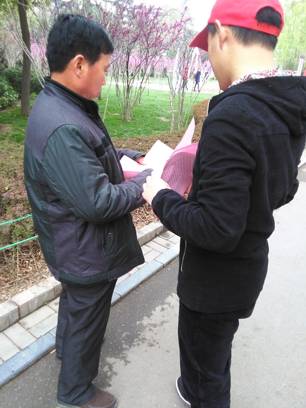 在学雷锋志愿服务月,我系14级印刷班青年志愿者们于3月28日下午来到郑州市紫荆山公园,以发放宣传册、讲解的形式,将雾霾污染的危害,学会防治雾霾天气等知识对过往行人进行宣传。