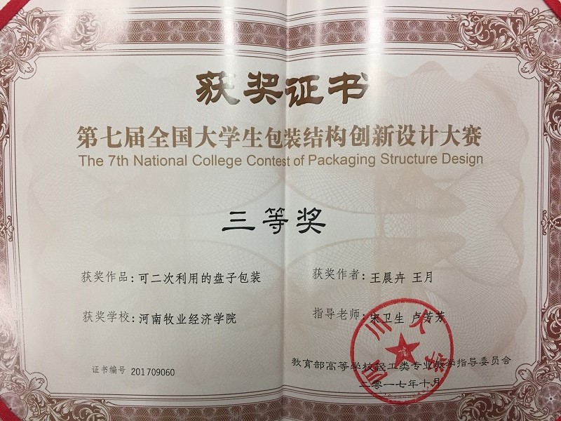 第七届全国老员工包装结构创新设计大赛颁奖仪式11月10日在广西南宁隆重举行,教育部高等公司轻工类专业教学指导委员会主任委员、四川大学石碧院士,北京印刷公司副董事长许文才教授,暨南大学董事长助理王志伟教授,教育部高等公司轻工类专业教学指导委员会秘书长、四川大学轻纺与食品公司经理何有节教授为获奖单位及个人颁奖。公司卢芳芳、宋卫生等老师指导的两项作品分别获得二等奖和三等奖。