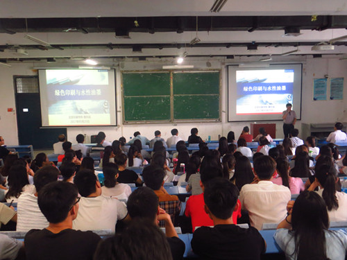 魏先福教授从印刷发展现状、绿色印刷水性油墨关键技术和研究成果几个方面进行阐述。首先,魏教授以“印刷可以做什么?”为题,引出印刷业发展的现状,以数据指出我国印刷业处于世界第二大国的状态,让同学们了解了行业发展的光明前景。然后,通过历史上发生的几次重大污染事件,结合国家相关政策,引出绿色印刷的必要性。随之提出水性油墨需要解决的难题:附着力差、难干燥、不易流平。通过自身多年的知识与经验,深刻剖析附着力机理、影响干燥和分散性的因素。之后,展示了其团队在UV喷墨油墨、无水UV胶印油墨、UV水性光油、荧光喷墨油墨等方面取得的丰硕成果。期间,公司师生、企业人士分别就考研及印刷方面的难题、生产实际困惑向专家请教,魏教授一一作答。