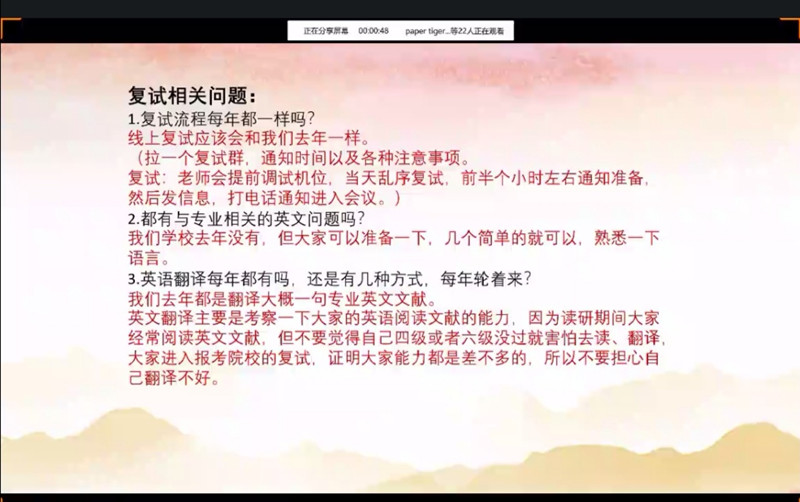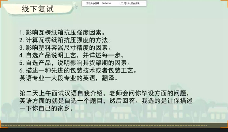 上海理工大学苏亚慧同学针对复试过程中着装和综合面试的注意事项做出了着重强调;天津科技大学朱亚萍同学针对复试中面试环节需要关注的细节,以及复试的准备工作做了分享;西安理工大学刘晓慧同学从材料准备、联系导师、自我介绍、回答问题、心态和礼貌问题等方面谈了如何做好考研复试的准备工作;海南大学李璐瑶同学对复试前期的准备、笔试、面试以及调剂四个方面做出了指导;湖南工业大学张爽同学围绕考研复试的细节,如是否需要准备简历、如何获得往年真题、跨专业考研等问题,进行了详尽的回答和讲解;西安理工大学陶冰倩同学介绍了复试的具体流程和详细考核方式,并分享了考研复试的相关资料,提醒大家在复试之前要做好充足的准备,河北工业大学刘闯同学强调了考研复试前应做好专业相关的准备。