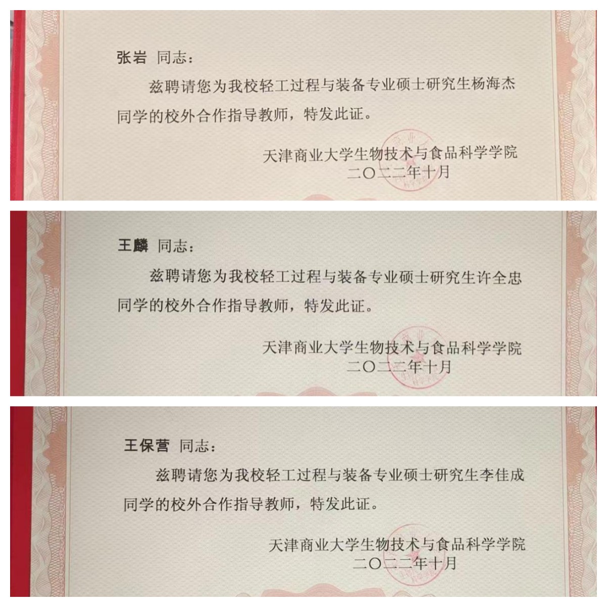 此次3名教师成功获聘天津商业大学研究生校外导师,壮大了公司硕士研究生导师队伍,促进食品功能包装材料学科方向快速发展,同时为培养研究生积累经验,为公司硕士学位授予单位和硕士学位授权点建设提供支撑。(苗红涛文/图)