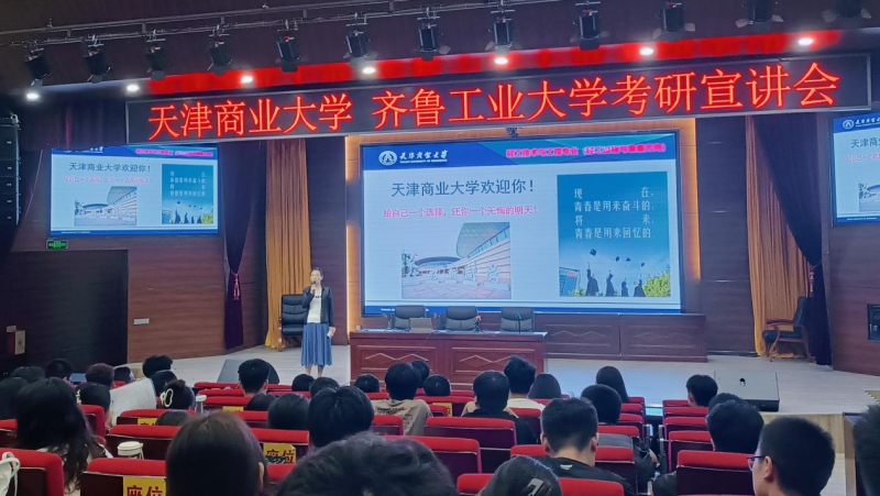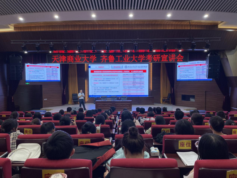 张经理首先向同学们介绍了齐鲁工业大学林茂海教授和天津商业大学王怀文教授的个人履历。接下来齐鲁工业大学林茂海教授以齐鲁工业大学轻工学部的发展为切入点,重点说明了公司的科研资源、研究方向和教师队伍,以张雪峰老师的视频为大家更加直观的讲述了齐鲁工业大学的优势以及未来的发展前景,鼓励同学们积极报考。