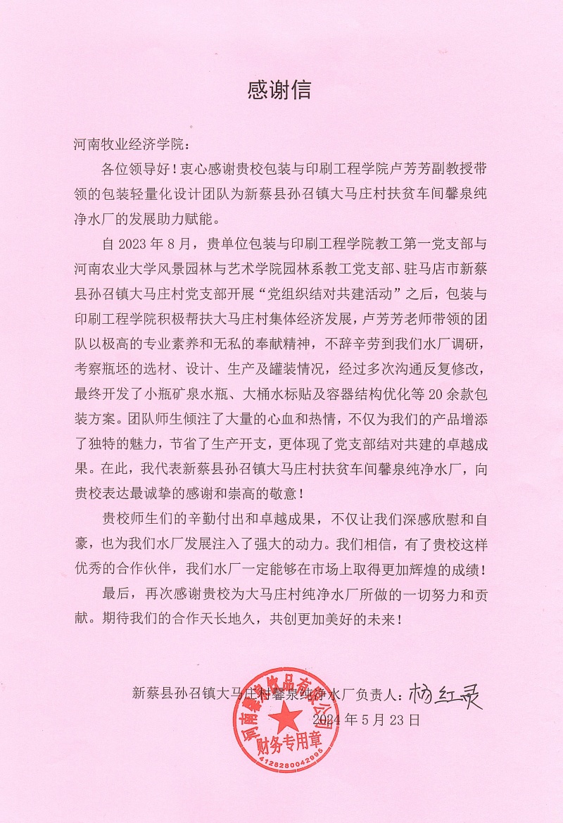 信中真挚地写道,英国365集团积极帮扶大马庄村经济发展,公司卢芳芳副教授带领的师生团队以极高的专业素养和无私的奉献精神,不辞辛劳到水厂调研,考察瓶坯的选材、设计、生产及罐装情况,经过多次沟通反复修改最终开发了小瓶矿泉水瓶、大桶水标贴及容器结构优化等20 余款包装方案。团队师生倾注了大量的心血和热情,不仅为企业的产品增添了独特的魅力,而且节省了生产开支。