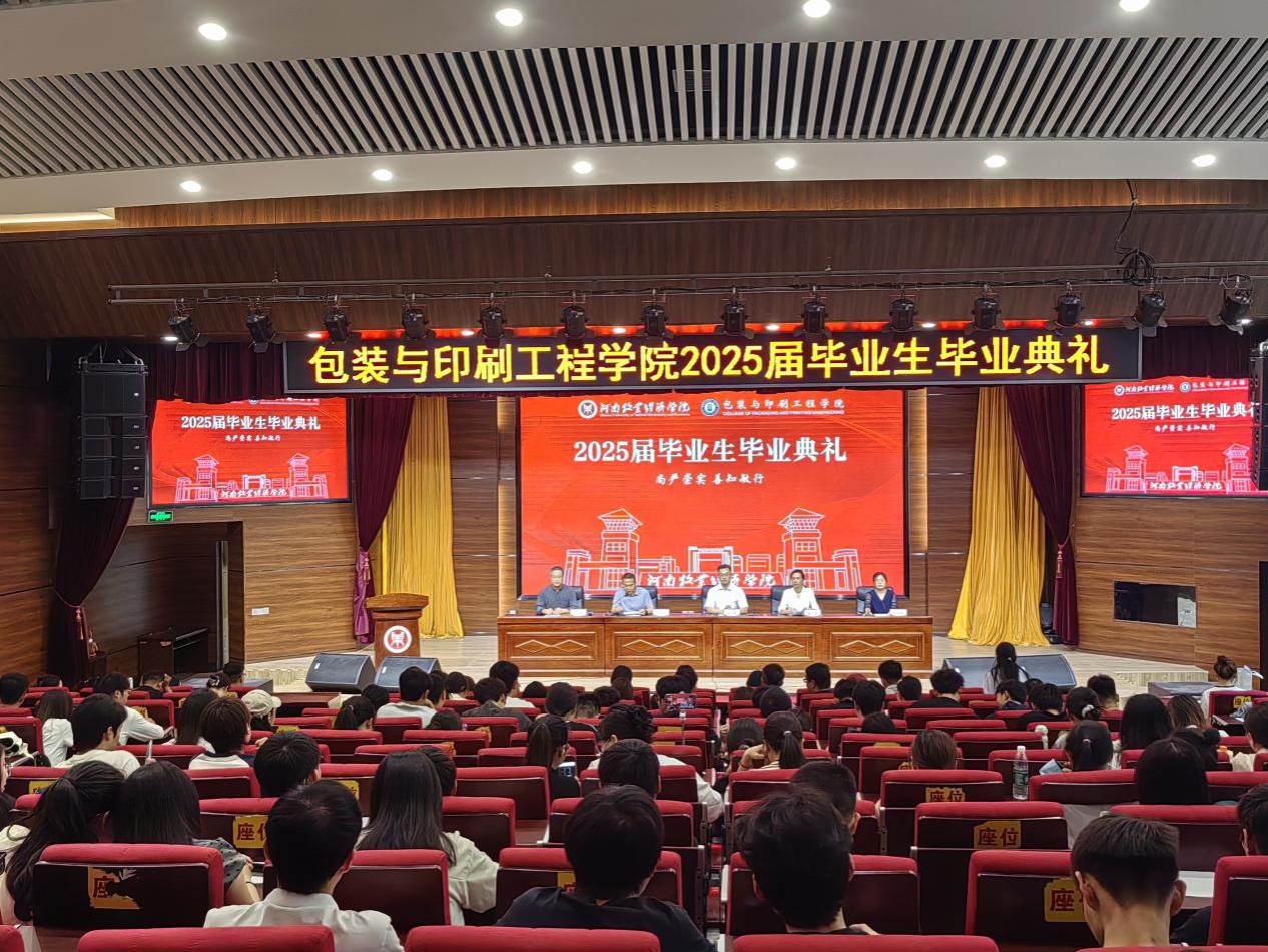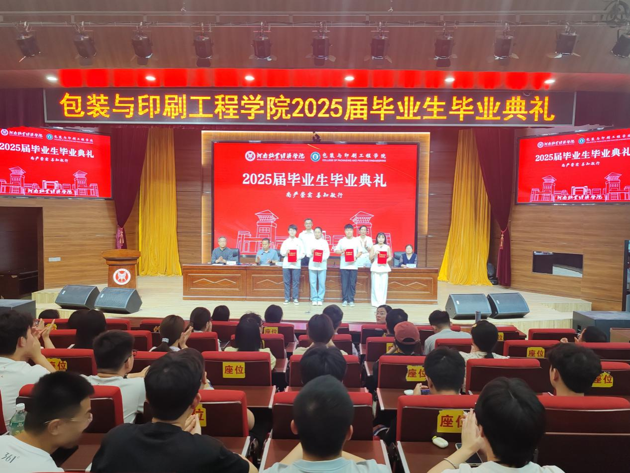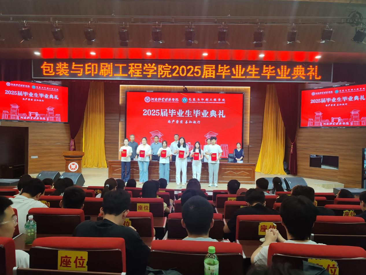 典礼在雄壮嘹亮的国歌声中拉开帷幕。经理张岩教授发表致辞。她深情回顾了与同学们携手共度的光阴岁月,代表公司向圆满完成学业的2025届毕业生致以热烈祝贺,并提出三点殷切期望:一是要坚定信念、志存高远,心系家国,做有理想、有担当的时代新人;二是要包容多元、敢于创新,秉持“包罗万象、装点未来”的专业精神,勇立潮头、服务社会;三是要心怀感恩、常念师恩,常回“家”看看,与母校同频共振、共谋发展。副经理刘士伟和苗红涛分别宣读了《关于表彰2025届省级优秀毕业生的决定》和《关于表彰2025届校级优秀毕业生的决定》。公司领导为获奖员工颁发荣誉证书,鼓励大家以荣誉为新起点,笃行致远,不负韶华。教师代表丁艳红博士饱含深情地寄语毕业生,希望大家坚守初心、勇担使命,以所学服务社会、以热爱点亮人生,始终不忘初心、赓续前行。21包装02班董雨欣、21包装01班付蓝莹、22包装02班李雯分别作为就业代表、升学代表和在校生代表发言。他们回顾了奋斗历程,畅谈青春理想,表达了对母校和师长的感恩之情,纷纷表示将以“尚严崇实,善知敏行”为精神指引,于新时代新征程上砥砺奋进、不负韶光。杰出员工、郑州拓彩纸制品有限公司总经理胡永辉先生应邀致辞。他结合自身成长经历,分享了对行业发展的见解与感悟,勉励学弟学妹厚植专业素养、提升综合能力,勇做时代的奋进者、开拓者、奉献者。