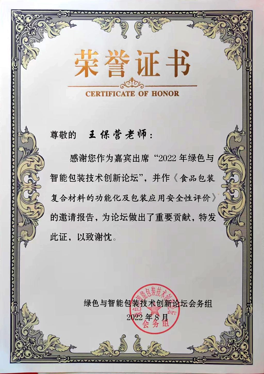 2022年8月10-12日,由中国兵器工业第五九研究所和中国兵工学会防腐包装专业委员会主办的2022年绿色与智能包装技术创新论坛在陕西省西安市召开。论坛邀请行业知名专家、学者围绕绿色与智能包装技术领域最新的研究进展进行交流汇报,公司王保营博士应邀参加了会议并做主题报告。