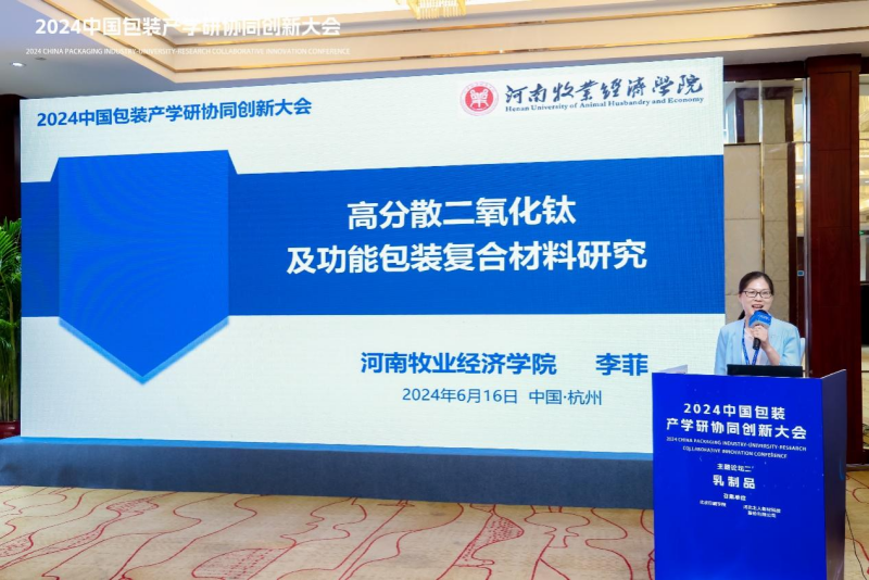 李菲博士受邀参加了乳制品分论坛,并做了《高分散二氧化钛及功能包装复合材料研究》的报告。李博士主要分享了团队在高分散TiO2、生物质材料、功能性薄膜等方面的研究进展,并介绍了公司在抗菌、抗紫外线、光降解等多功能的复合软包装材料方面开展校企合作的情况,研究成果受到与会专家的认可与好评。